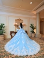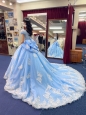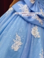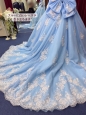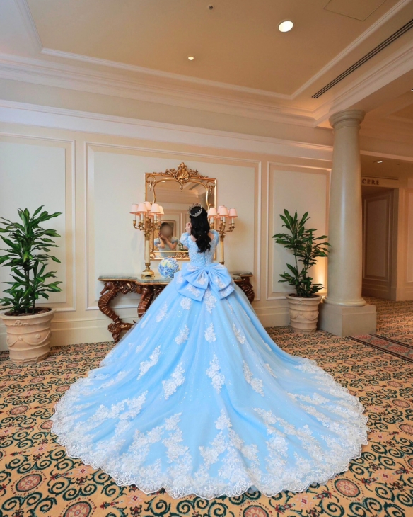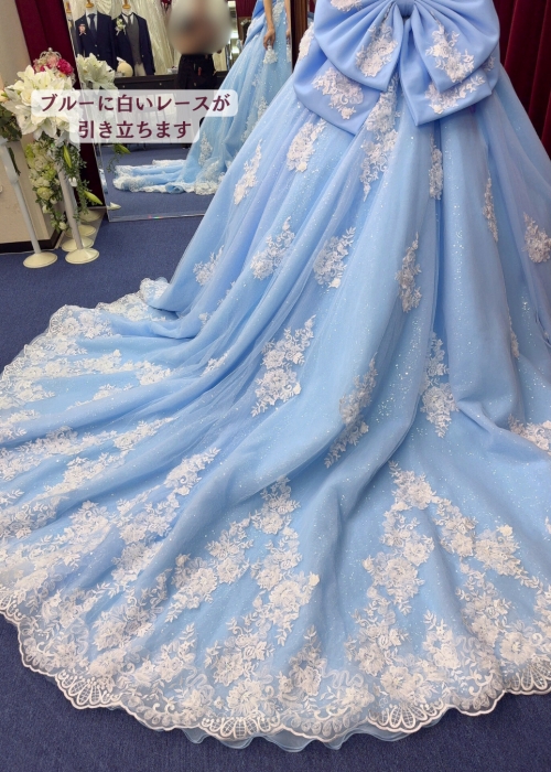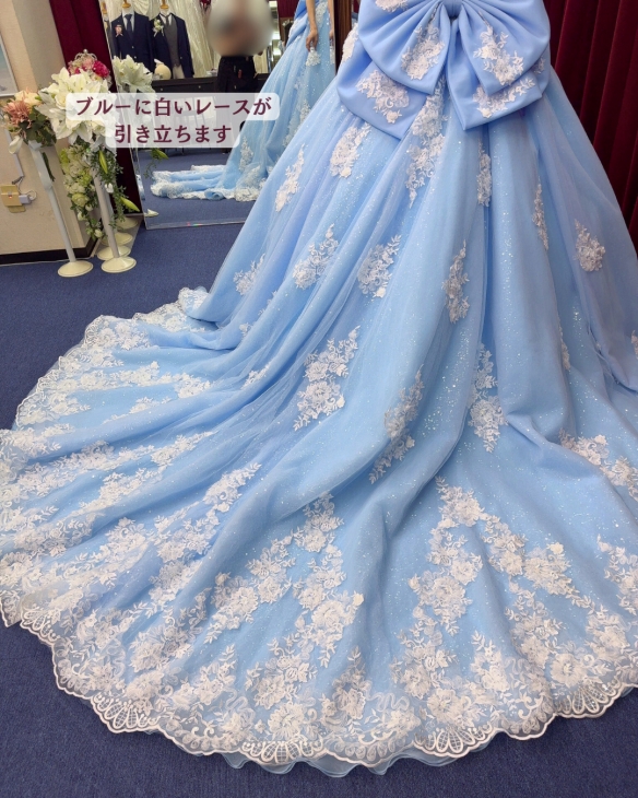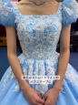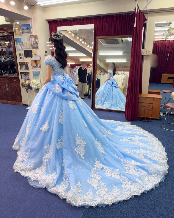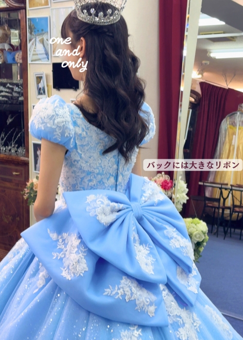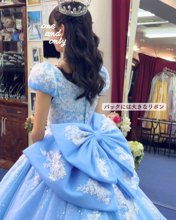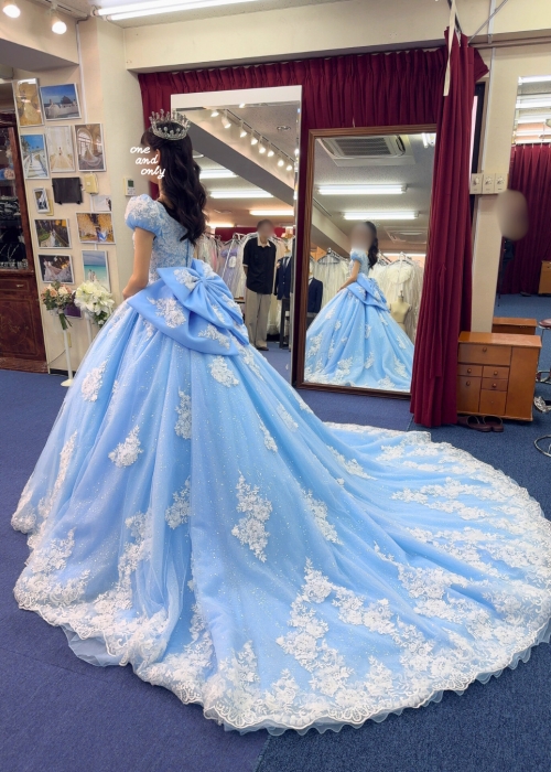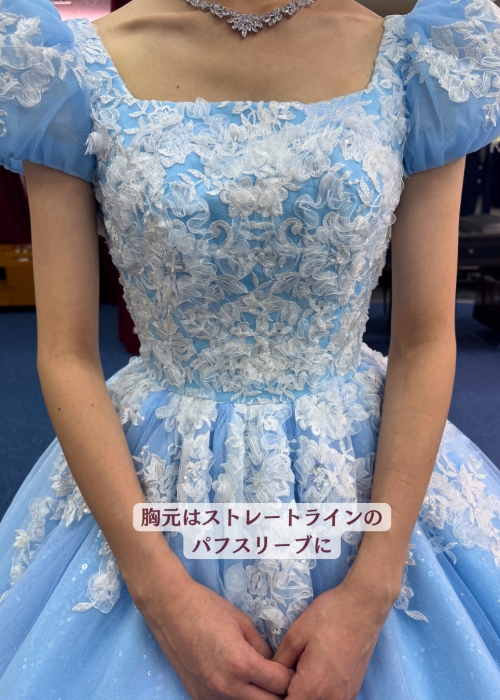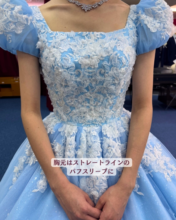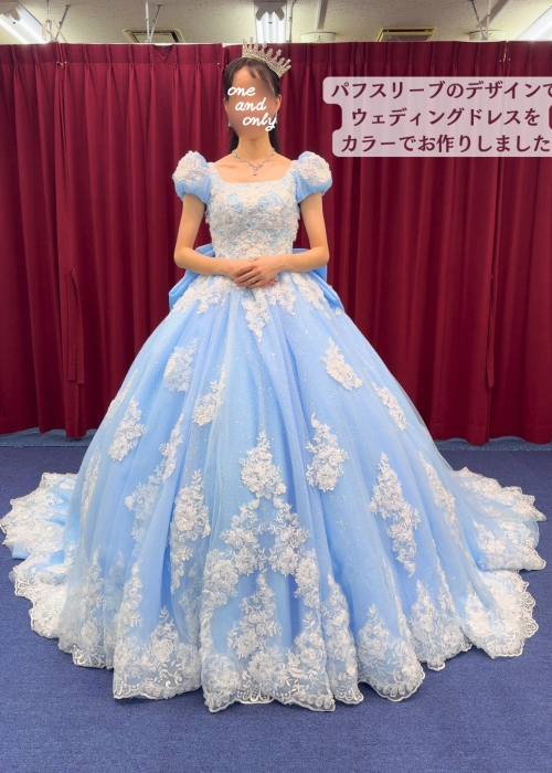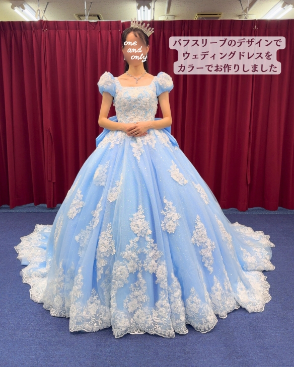 シンデレラのようなブルーのパフスリーブドレス パフスリーブのドレス自体なかなか見つからないのに カラードレスのパフスリーブはもっと見つけるのが難しい… こちらはセリーナのカラーとデザインを変更しました 無いならお作りできます。 自分好みの体型ぴったりにお作りできるのが オーダードレスのいいところ‼️